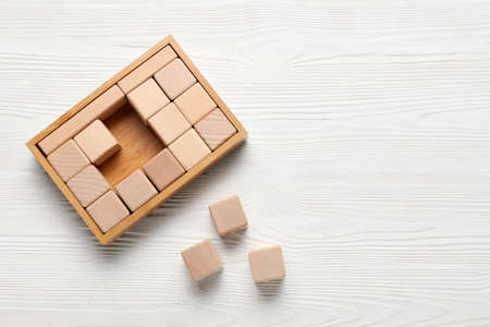 Logical puzzle game wooden cube puzzle view from above on a yellow background close up with copy space. Solving logical problems