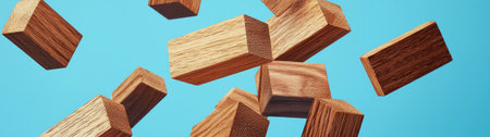 Floating wooden blocks against a light blue background, symbolizing creativity and construction, ideal for educational and design themes