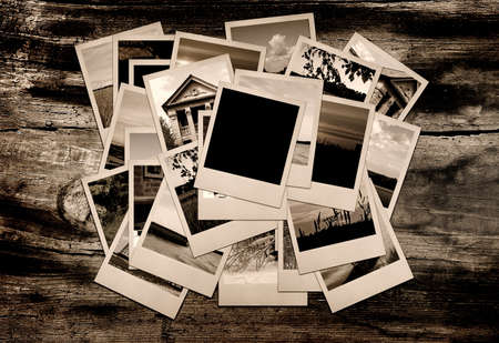 Stacked old photos backside with blank copy space , on repurposed oak wood texture background. abstract textured backdrop