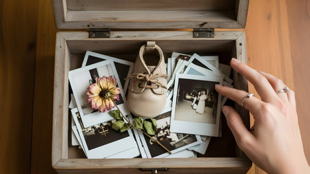 A hand opens a wooden box containing vintage photographs baby shoes and a dried flower on a wooden floor representing memories and nostalgia.