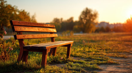 A tranquil wooden bench sits in a beautiful park during sunrise, surrounded by lush grass and illuminated by soft golden light, inviting moments of reflection and peace.