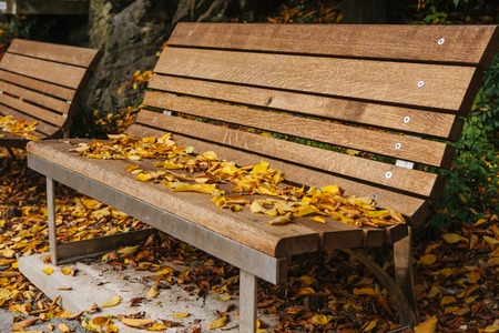 Wooden benches in a park with yellow foliage in autumn. Autumn scene.