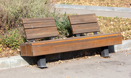 Detail of a empty wooden bench in a city public park with sun. Different perspective