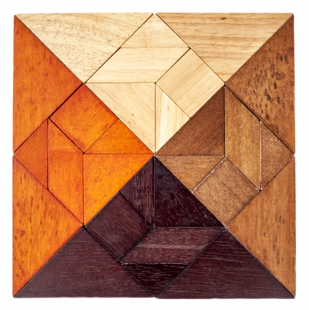 square shape created from 4 sets of wood tangram, a traditional Chinese puzzle game
