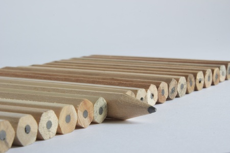 One sharpened pencils in row with pencil ends,