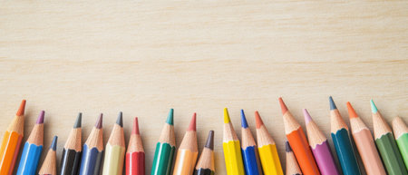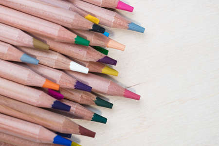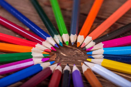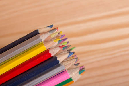 Education and creativity concept: colored pencils on wooden background.