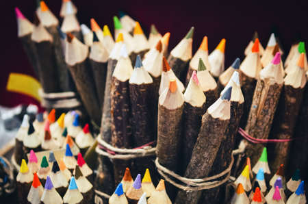 Artist's working place. Pile of multicolored pencils on stone table. Retro toned.