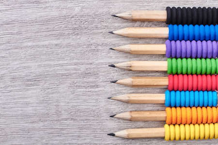 Set of sharp colorful pencils are in a row on a wooden blank board.