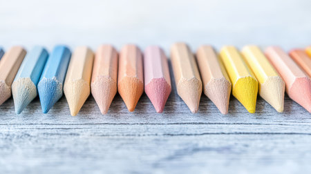 Assorted colored pencils in soft pastel hues neatly lined up on a light wooden table showcasing their pointed tips and vibrant colors.