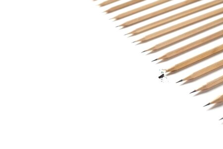Close up of wooden pencils scattered on white background