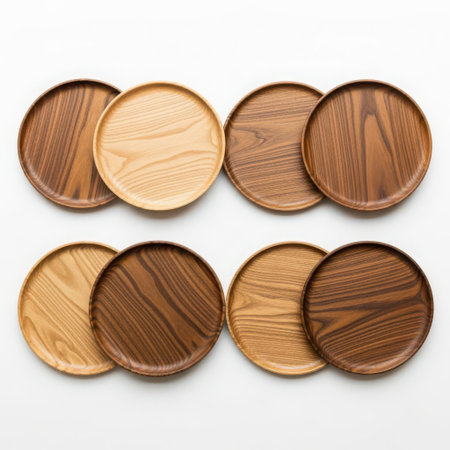 This image features a set of wooden plates with various grain patterns and colors, arranged in two rows on a white background. The plates are made from different types of wood, showcasing their unique textures and hues.