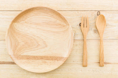 A wooden spoon and fork on a plate. Wood texture backgroud