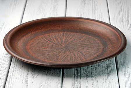 An empty round ceramic plate on a table. An empty plate as a background for your design
