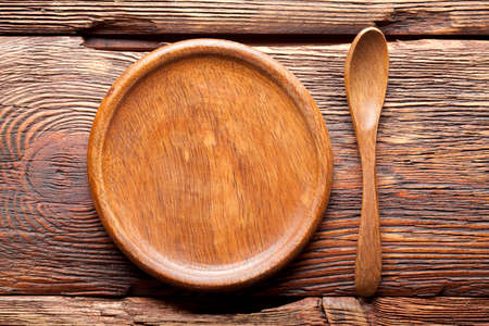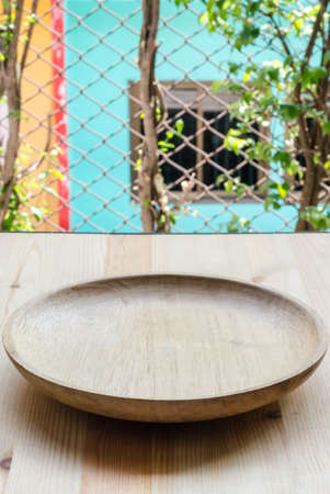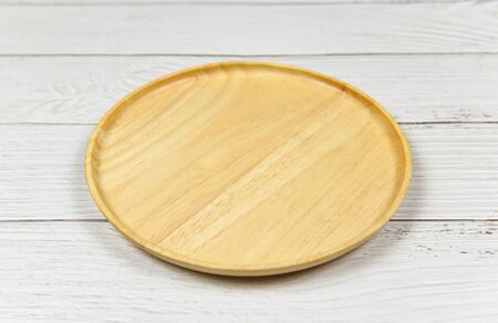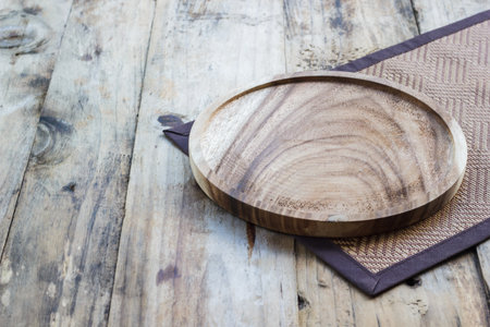 Empty wooden plate on wood table. Copy space. Wood plate for food or vegetable serving to customers. A plate made from wood and widely used in vintage restaurant because looks beautiful and natural.