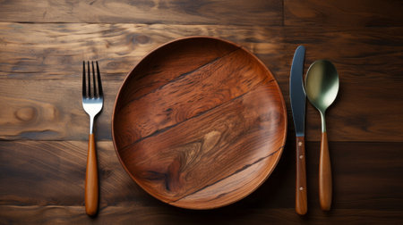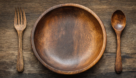 A wooden bowl, fork, and spoon are presented on a textured wooden surface. The composition features warm tones and natural materials. This overhead shot highlights the objects with soft lighting. Suitable for culinary, lifestyle, or design applications.