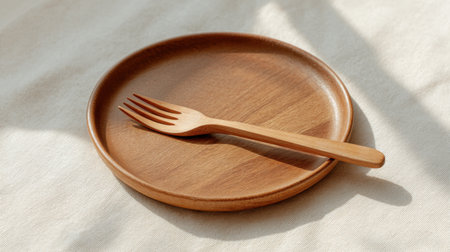A minimalist wooden plate paired with a well-crafted fork rests on soft fabric, highlighting natural light and inviting warmth, perfect for modern dining aesthetics.