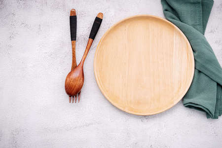 Empty wooden plate and green linen napkin with wooden spoon on white concrete background .