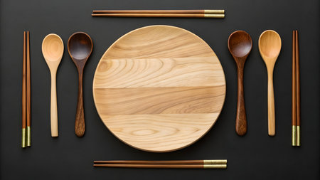 Empty wooden plate, chopsticks and wooden spoon on black background.