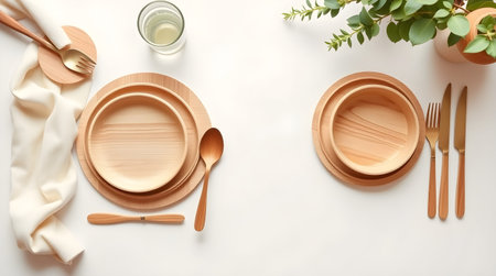 A stylishly arranged table setting features wooden plates, cutlery, and greenery on a clean white surface, perfect for a sophisticated dining experience.