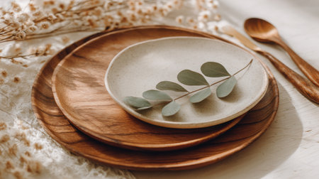 A captivating arrangement featuring textured wooden plates paired with a minimalist ceramic dish, adorned with a delicate greenery accent, perfect for rustic dining setups.