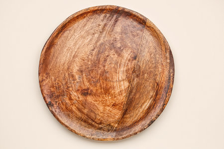 The brown wooden plate on a rustic table closeup. Top View with Copy Space for Text, wooden background.