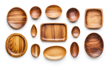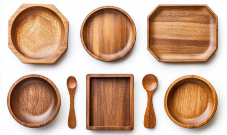 Set of wooden plates and bowls isolated on a white background, top view. Flat lay style. In the style of Japanese design. The set includes different shapes like square, circular, or hexagonal. In the center, there is one solid wood plate with rounded edges. All elements have a visible grain texture. A4 format. Isolated on a white background. --ar 5:3 --v 6.1 Job ID: ca79b863-929f-4f23-9cd9-a50393e117df