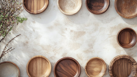 A captivating display of assorted wooden bowls arranged gracefully on a rustic surface, complemented by natural elements, perfect for culinary art and home decor ideas.