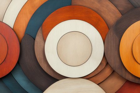 Various wooden circles in different shades are arranged closely on a flat surface, showing a vibrant and modern design. The composition emphasizes texture and color variety.