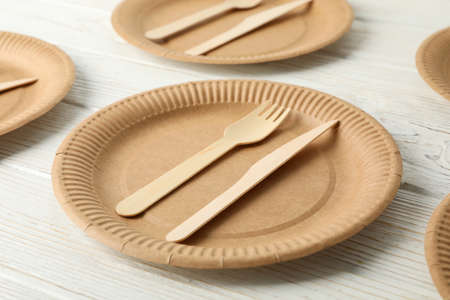 Flat lay with eco - friendly dishware on white wooden background. Disposable tableware