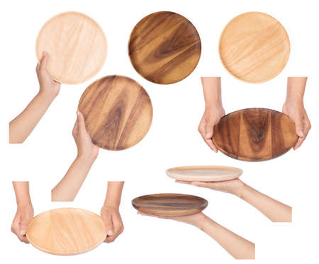 Set of wooden Kitchenware cutlery untensil handmade vintage (fork, spoon, plate) on isolated white background