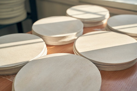 Sunlit wooden circles stacked on table in workshop with natural light shadows.
