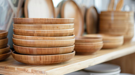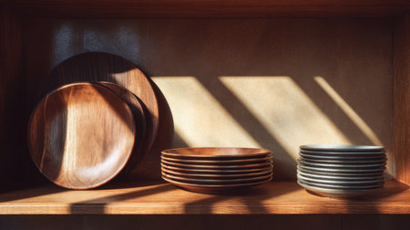 A beautifully arranged shelf showcasing wooden and ceramic plates, enhanced by the gentle play of natural light and shadows, creating an inviting and warm atmosphere.