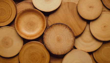 This image showcases a variety of natural wooden discs arranged in a visually appealing pattern. The different shades and textures highlight the beauty of wood in artistic and craft applications.