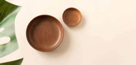 Wooden bowls and blur monstera leaf. Two empty plates on light beige background with copy space banner format, top view. Mockup for menu or recipe. Concept organic vegan food