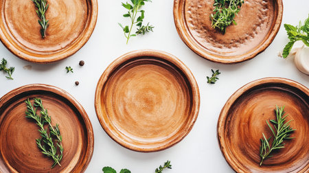 Beautiful rustic plates arranged with fresh herbs, creating an inviting culinary scene. Perfect for food photography, kitchen decor, or rustic dining themes.