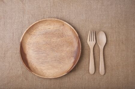 Top view : Empty wood plate with spoon and fock and alarm clock on brown sackcloth. Alarm clock remind eat breakfast. Diet time with empty food on wood plate. proper nutrition, discipline, adhere to diet time. Empty foods at breakfast concept.
