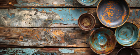 Handmade empty ceramic dishes and plates on wooden background. Collections of various bowls, traditional folk ornament, rustic style, vintage table. Passover table concept, Banner