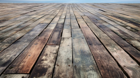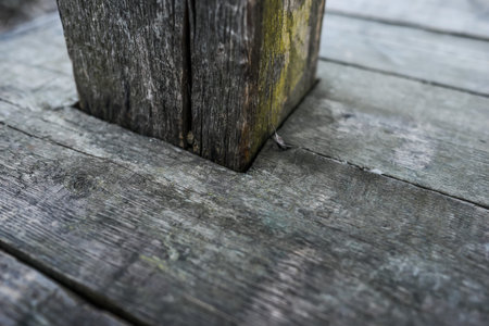 Old weathered white boards on a jetty or outdoor deck in a close up oblique angle view