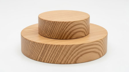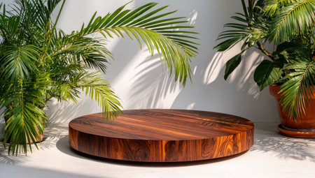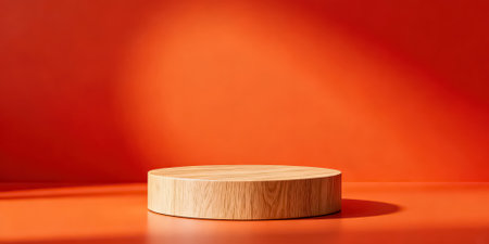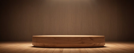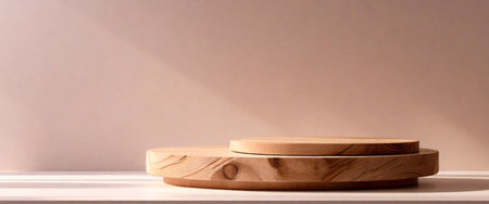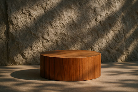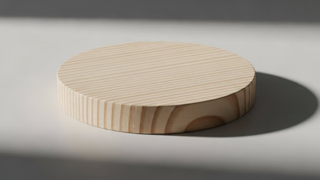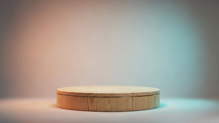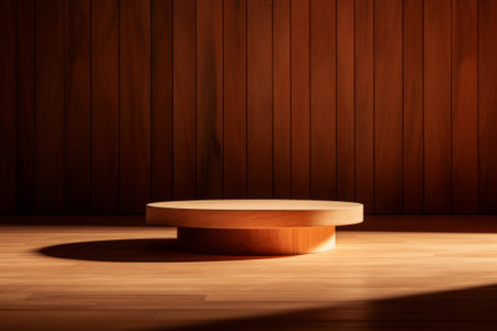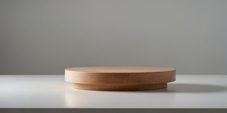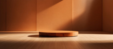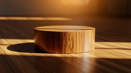 Wooden circular podium with soft daylight streaming across minimalist background.
