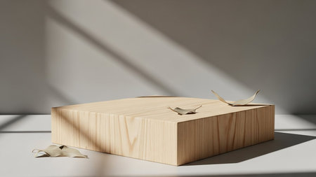 A light wooden block pedestal with dry leaves scattered on its surface, illuminated by dramatic shadows cast from sunlight.