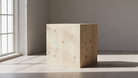 A light wood cube display stand sits in a bright room, illuminated by soft sunlight streaming through a window, creating light patterns.