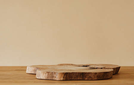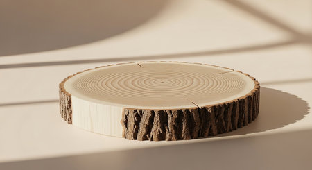 A natural wood slice podium with rough bark edges and prominent tree rings sits on a beige background, casting soft shadows.