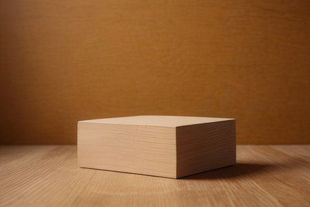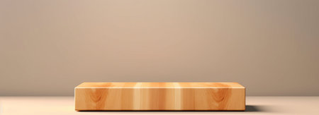Horizontal template for mockup, banner. Wooden pedestal on brown beige background. Flat square stand or podium for natural design concept. Center composition, hard light, front view