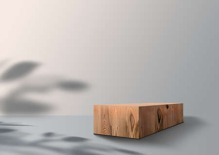 Wooden pedestal for display,Platform for design,Blank product stand in Empty room with Tree shadow on the wall .3D rendering.