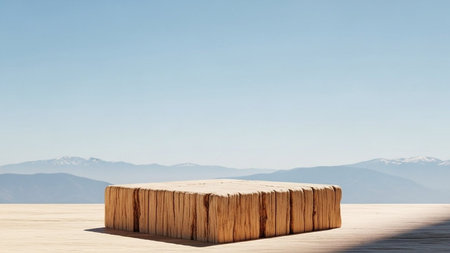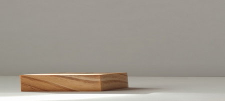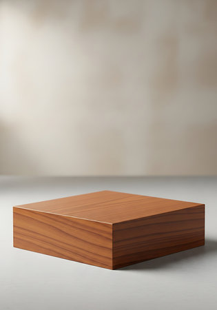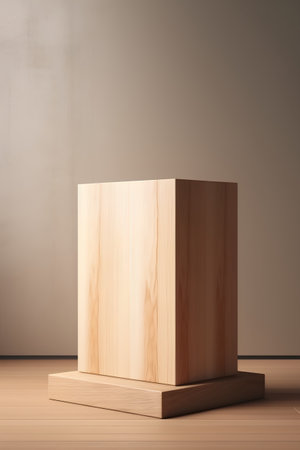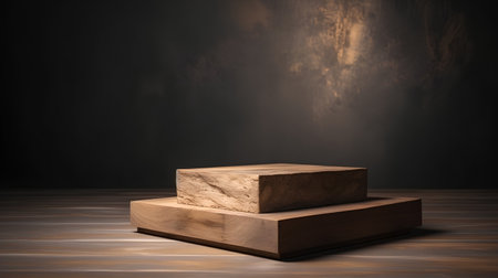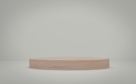 Product presentation platform with natural wood texture, grey backdrop perfect for highlighting new items or promotional goods