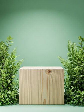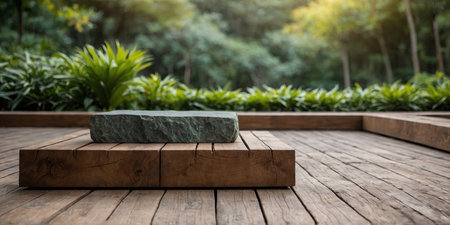AI Generated. Green Podium Display Platform Wood Stone Garden