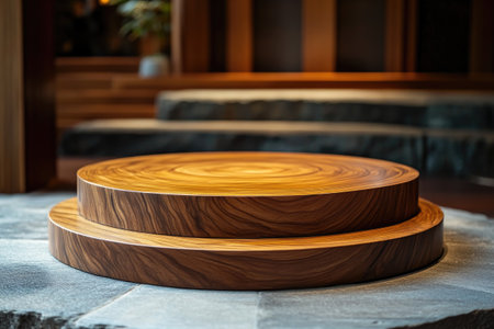 Two round wooden boards with visible growth rings, creating a small podium in a blurred interior design setting