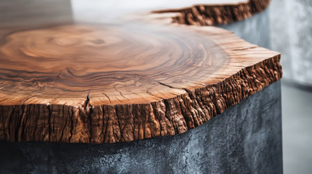 A stunning wooden tabletop showcases intricate grain patterns and a natural edge, enhancing the aesthetic of a contemporary room filled with natural light.