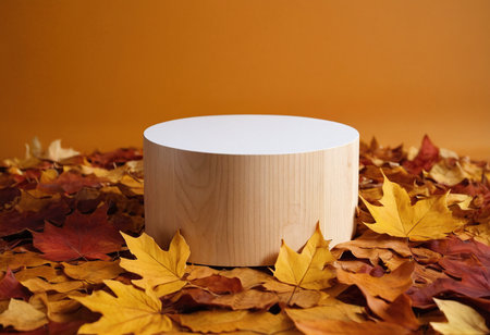 Wooden podium on autumn leaves background. Mockup for product presentation.