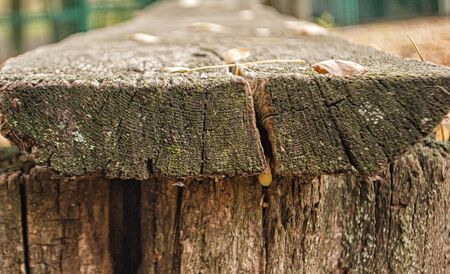 Old decrepit bench in a city park in the fall afternoon retro. Front view